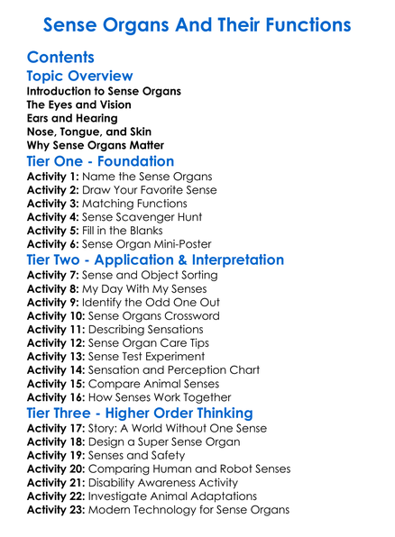 Sense Organs And Their Functions Worksheet Activity Booklet