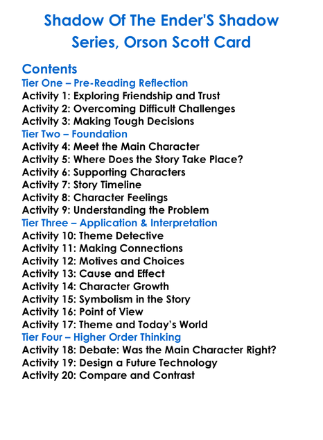 Shadow Of The Enders Shadow Series Orson Scott Card Worksheet Activity Booklet