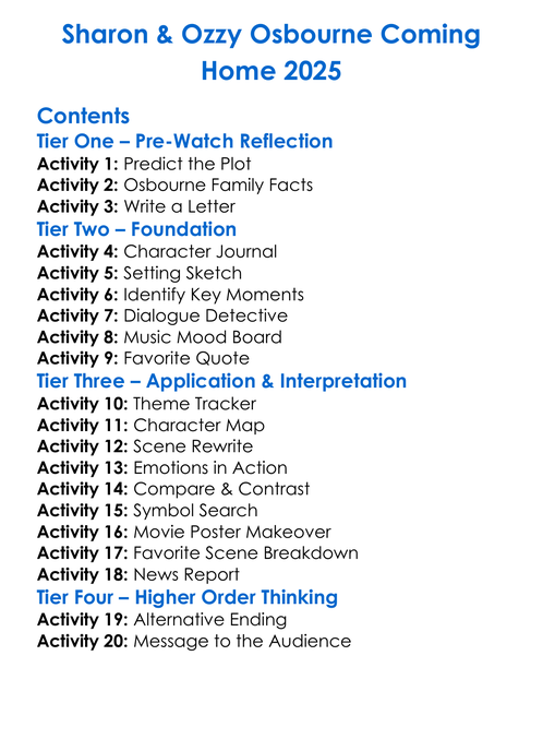 Sharon Ozzy Osbourne Coming Home 2025 Worksheet Activity Booklet