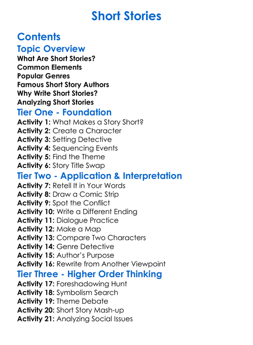 Short Stories Worksheet Activity Booklet