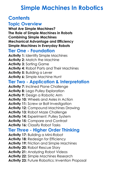 Simple Machines In Robotics Worksheet Activity Booklet