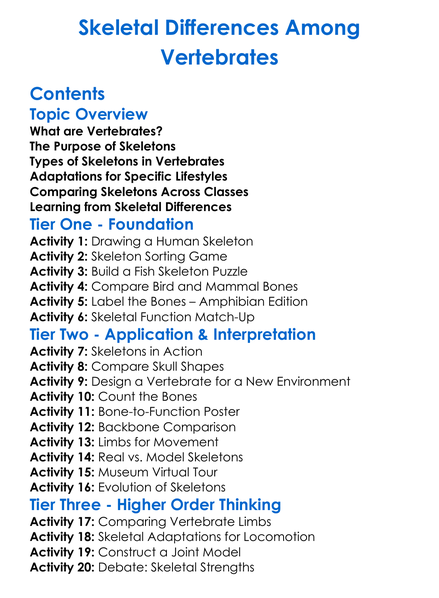 Skeletal Differences Among Vertebrates Worksheet Activity Booklet