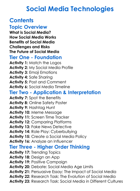 Social Media Technologies Worksheet Activity Booklet