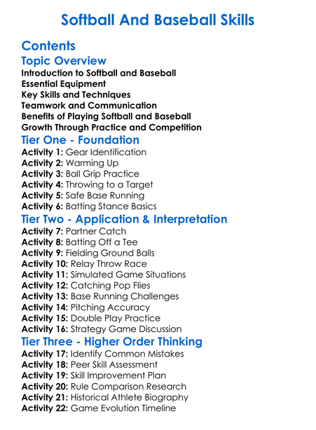 Softball And Baseball Skills Worksheet Activity Booklet
