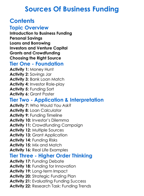 Sources Of Business Funding Worksheet Activity Booklet
