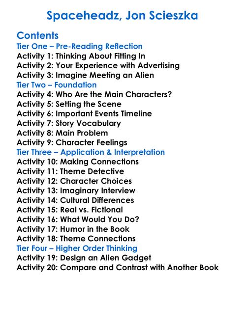 Spaceheadz Jon Scieszka Worksheet Activity Booklet