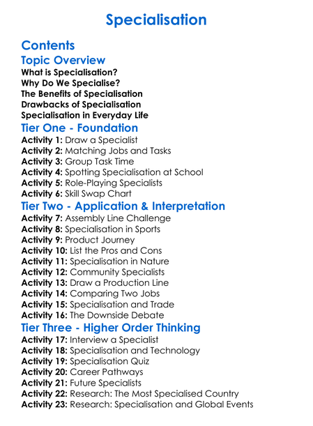 Specialisation Worksheet Activity Booklet