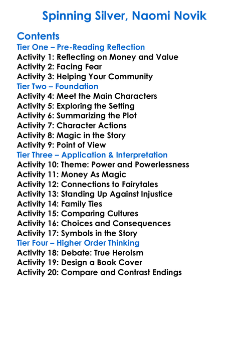 Spinning Silver Naomi Novik Worksheet Activity Booklet