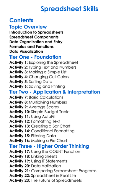 Spreadsheet Skills Worksheet Activity Booklet