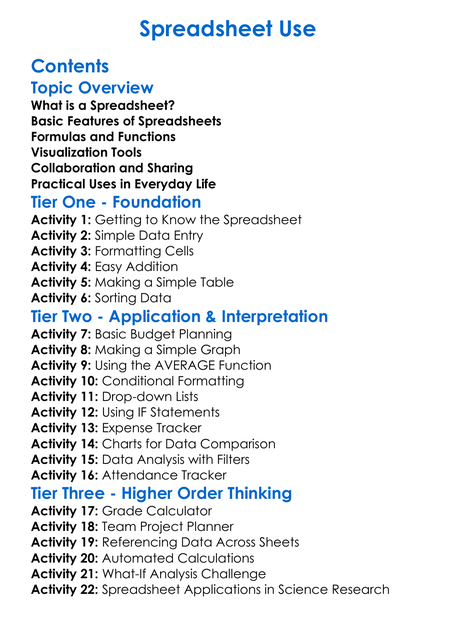 Spreadsheet Use Worksheet Activity Booklet