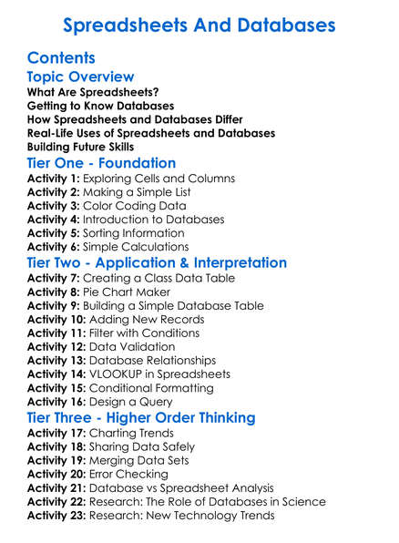 Spreadsheets And Databases Worksheet Activity Booklet