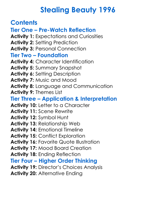 Stealing Beauty 1996 Worksheet Activity Booklet