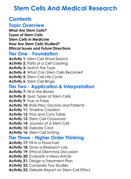 Stem Cells And Medical Research Worksheet Activity Booklet
