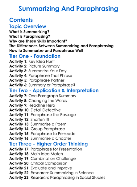 Summarizing And Paraphrasing Worksheet Activity Booklet