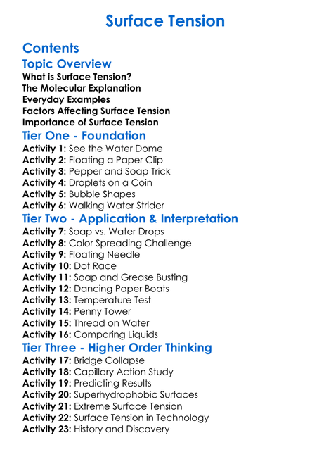 Surface Tension Worksheet Activity Booklet