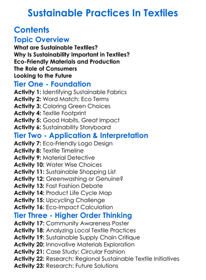 Sustainable Practices In Textiles Worksheet Activity Booklet