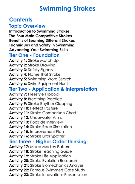 Swimming Strokes Worksheet Activity Booklet