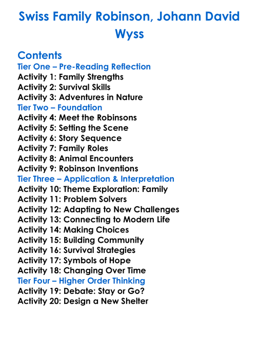 Swiss Family Robinson Johann David Wyss Worksheet Activity Booklet