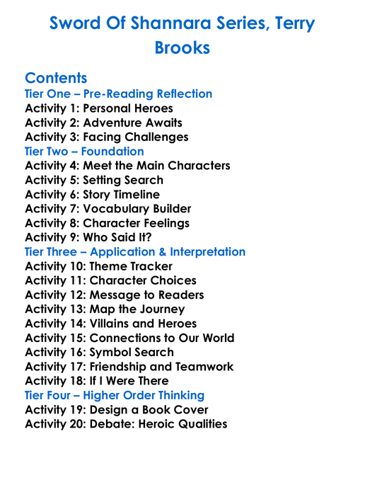 Sword Of Shannara Series Terry Brooks Worksheet Activity Booklet