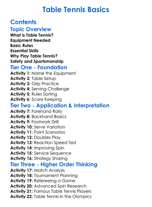 Table Tennis Basics Worksheet Activity Booklet
