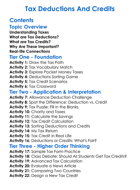 Tax Deductions And Credits Worksheet Activity Booklet