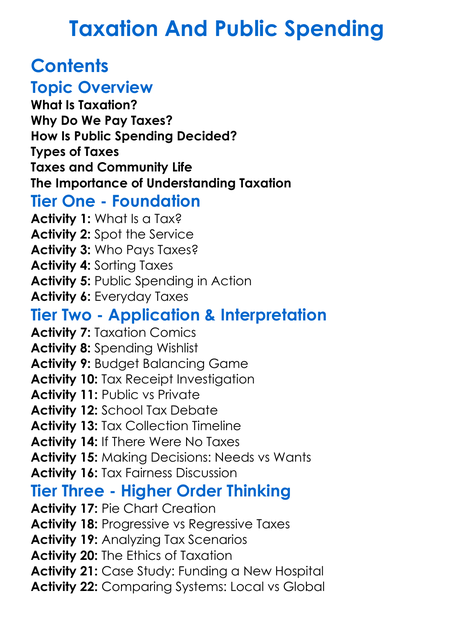Taxation And Public Spending Worksheet Activity Booklet