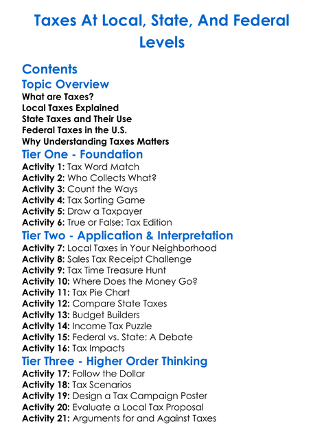 Taxes At Local State And Federal Levels Worksheet Activity Booklet