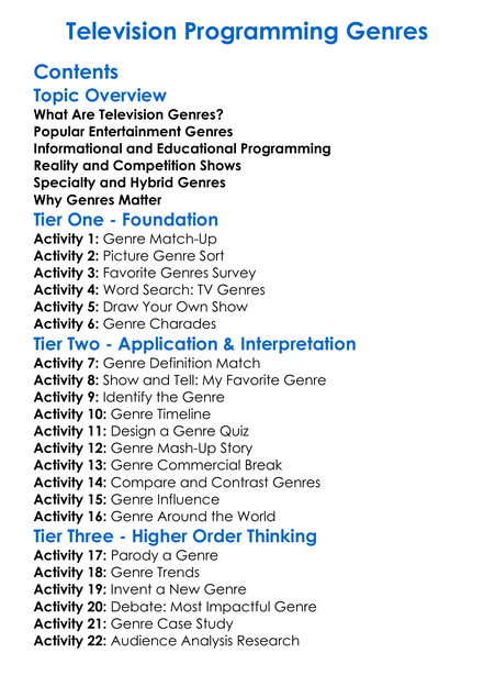 Television Programming Genres Worksheet Activity Booklet