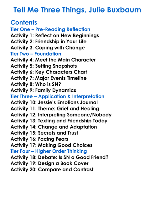 Tell Me Three Things Julie Buxbaum Worksheet Activity Booklet