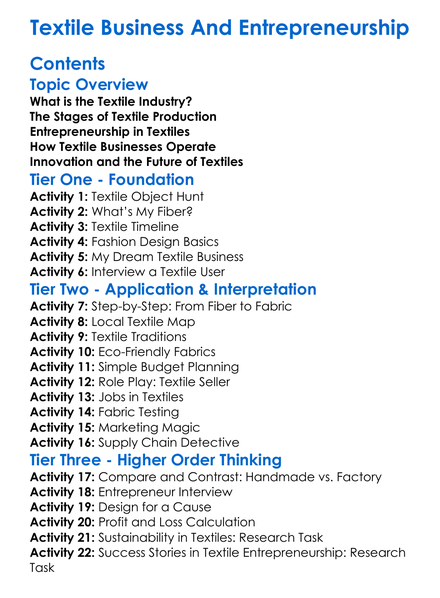 Textile Business And Entrepreneurship Worksheet Activity Booklet