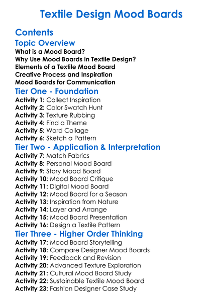 Textile Design Mood Boards Worksheet Activity Booklet