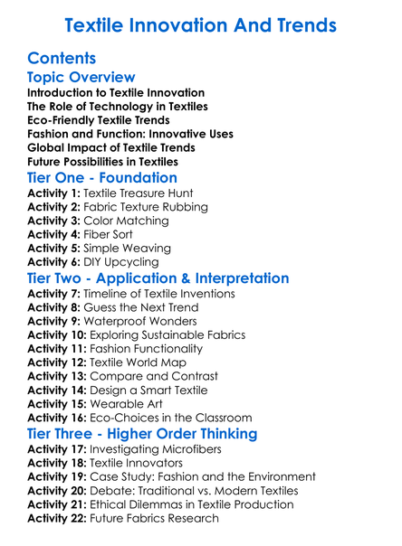 Textile Innovation And Trends Worksheet Activity Booklet