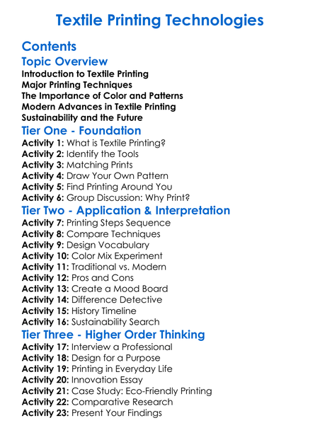 Textile Printing Technologies Worksheet Activity Booklet