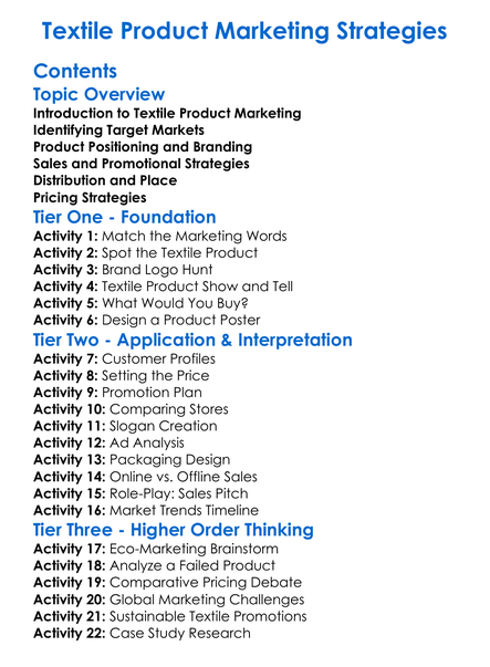 Textile Product Marketing Strategies Worksheet Activity Booklet