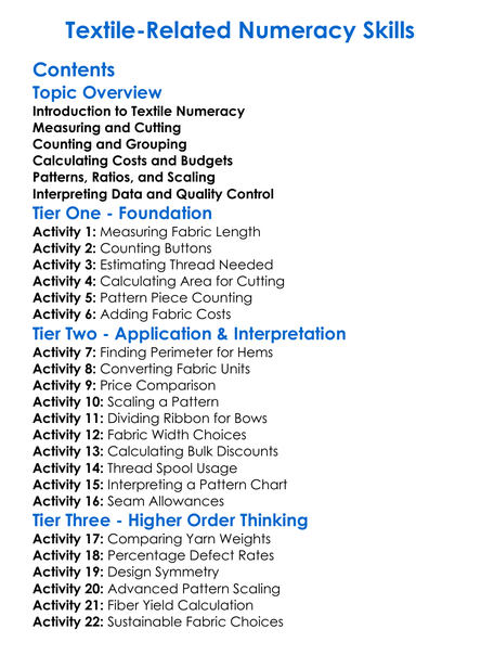 Textile-Related Numeracy Skills Worksheet Activity Booklet