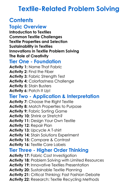 Textile-Related Problem Solving Worksheet Activity Booklet