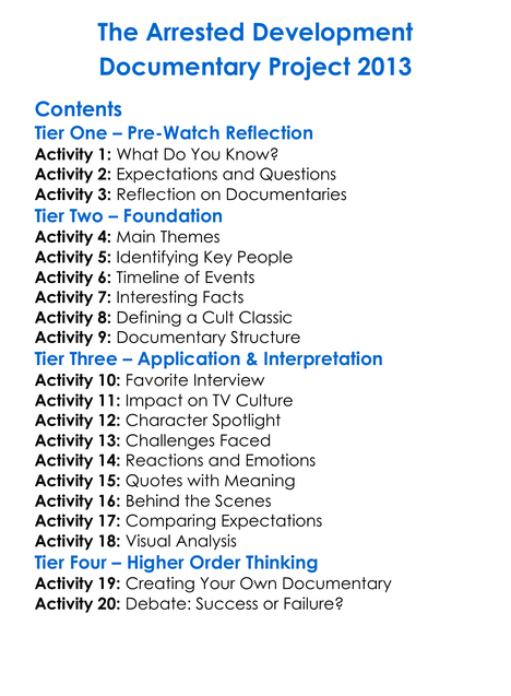 The Arrested Development Documentary Project 2013 Worksheet Activity Booklet