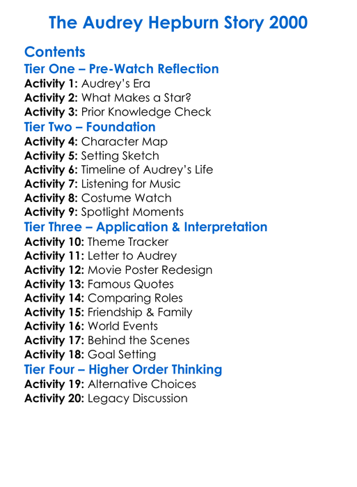 The Audrey Hepburn Story 2000 Worksheet Activity Booklet