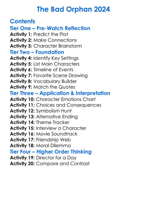 The Bad Orphan 2024 Worksheet Activity Booklet
