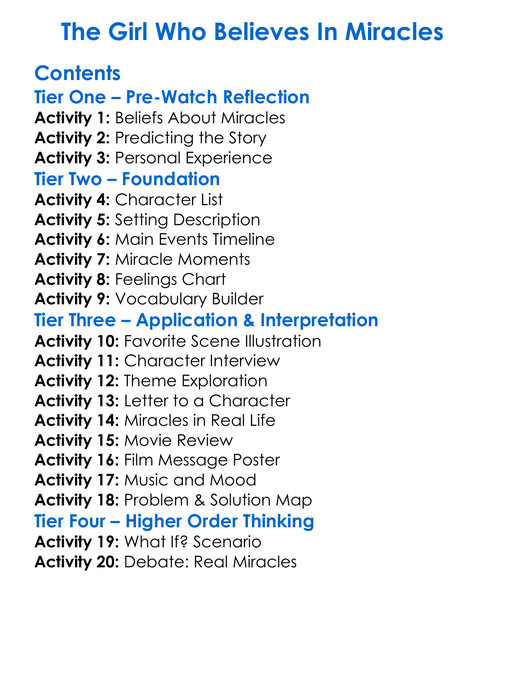 The Girl Who Believes In Miracles Worksheet Activity Booklet