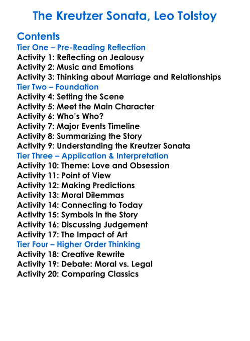 The Kreutzer Sonata Leo Tolstoy Worksheet Activity Booklet