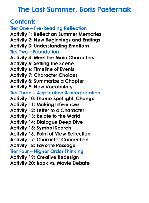 The Last Summer Boris Pasternak Worksheet Activity Booklet