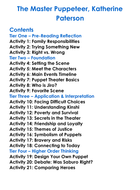 The Master Puppeteer Katherine Paterson Worksheet Activity Booklet