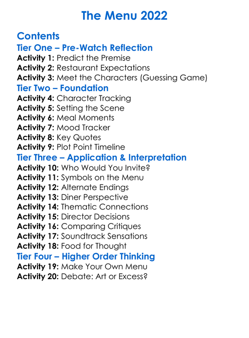 The Menu 2022 Worksheet Activity Booklet