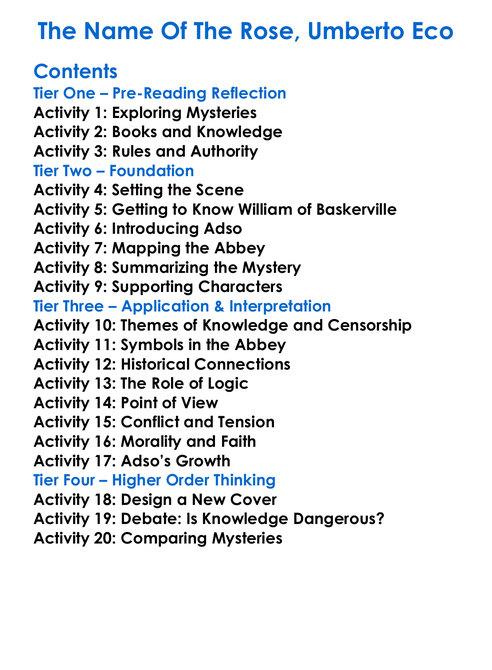 The Name Of The Rose Umberto Eco Worksheet Activity Booklet