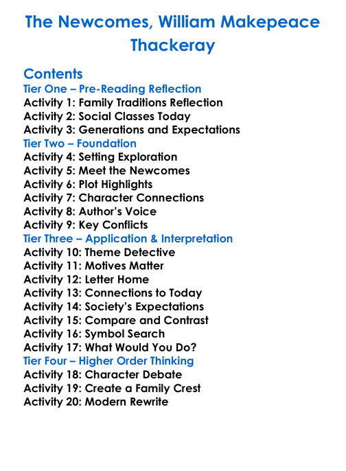 The Newcomes William Makepeace Thackeray Worksheet Activity Booklet
