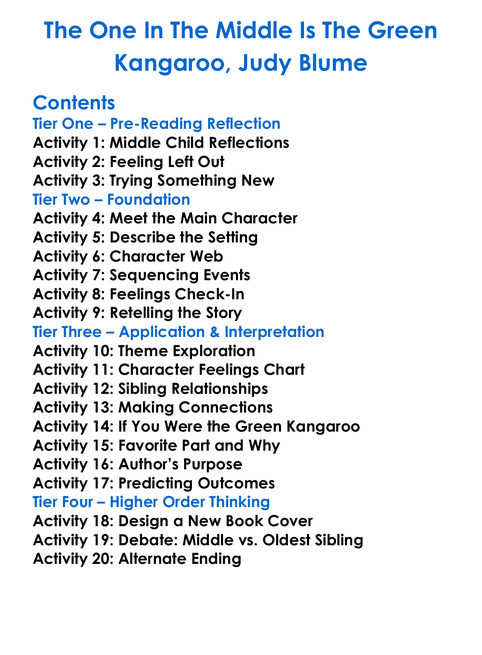The One In The Middle Is The Green Kangaroo Judy Blume Worksheet Activity Booklet