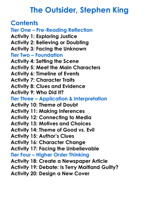 The Outsider Stephen King Worksheet Activity Booklet