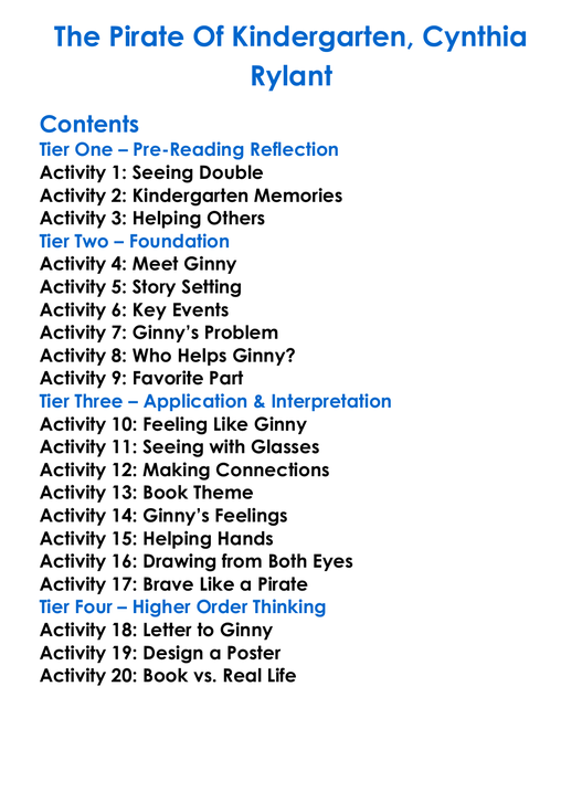 The Pirate Of Kindergarten Cynthia Rylant Worksheet Activity Booklet