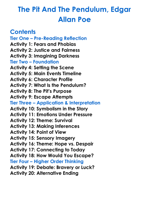 The Pit And The Pendulum Edgar Allan Poe Worksheet Activity Booklet